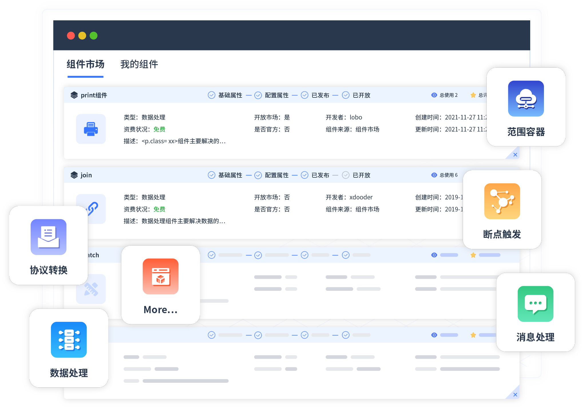 针对集成场景,,,,VIVO钱包提供组件市场,,,,例如协议转换、、、消息处理、、文件操作等。。除平台提供的组件外,,,,客户可以自定义所需组件。。