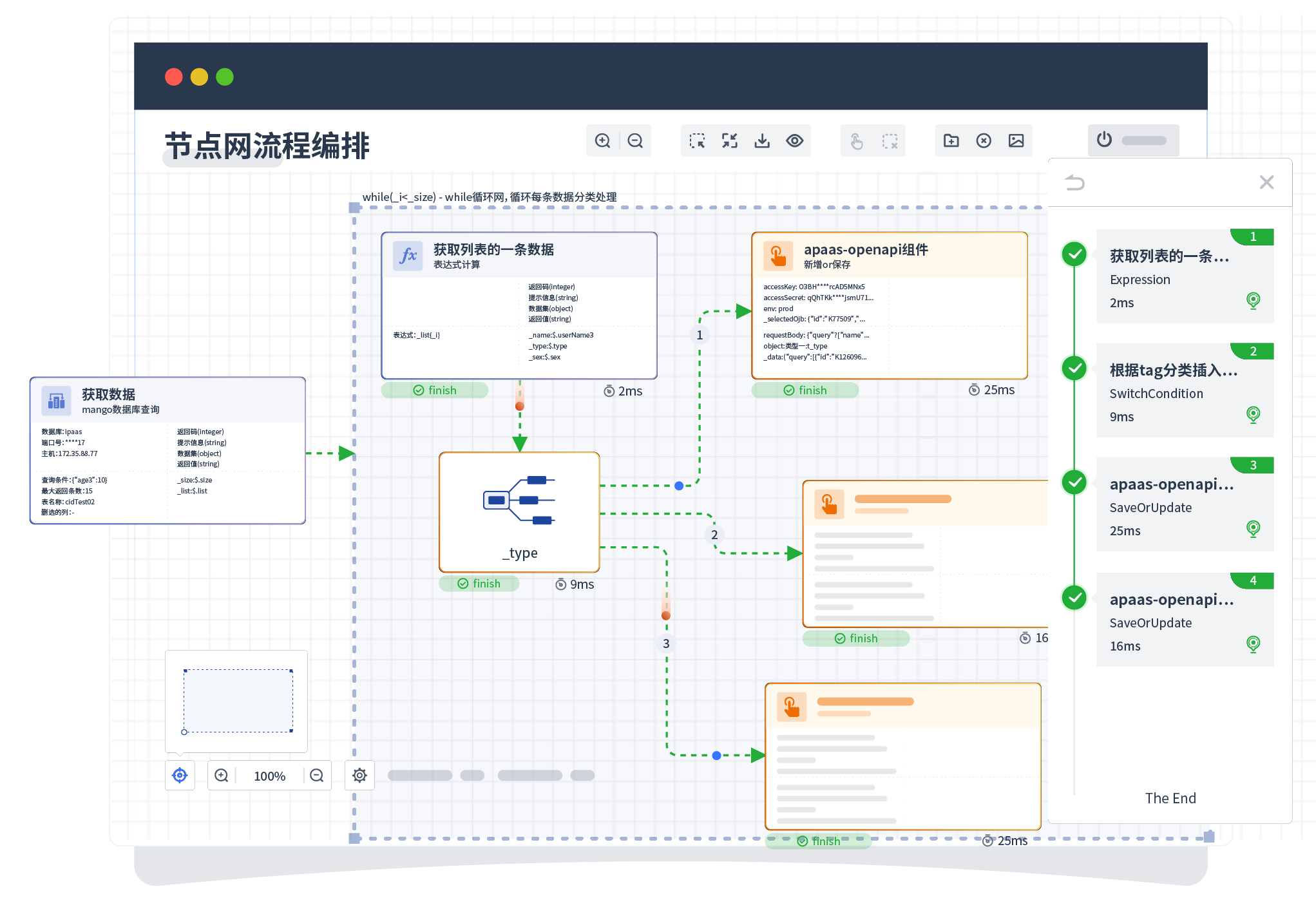针对集成场景,,,,组件定义后支持进行流程编制,,不同于传统代码方式,,,通过图形化展示,,,支持在线调试、、日志查看和运行回放。。。